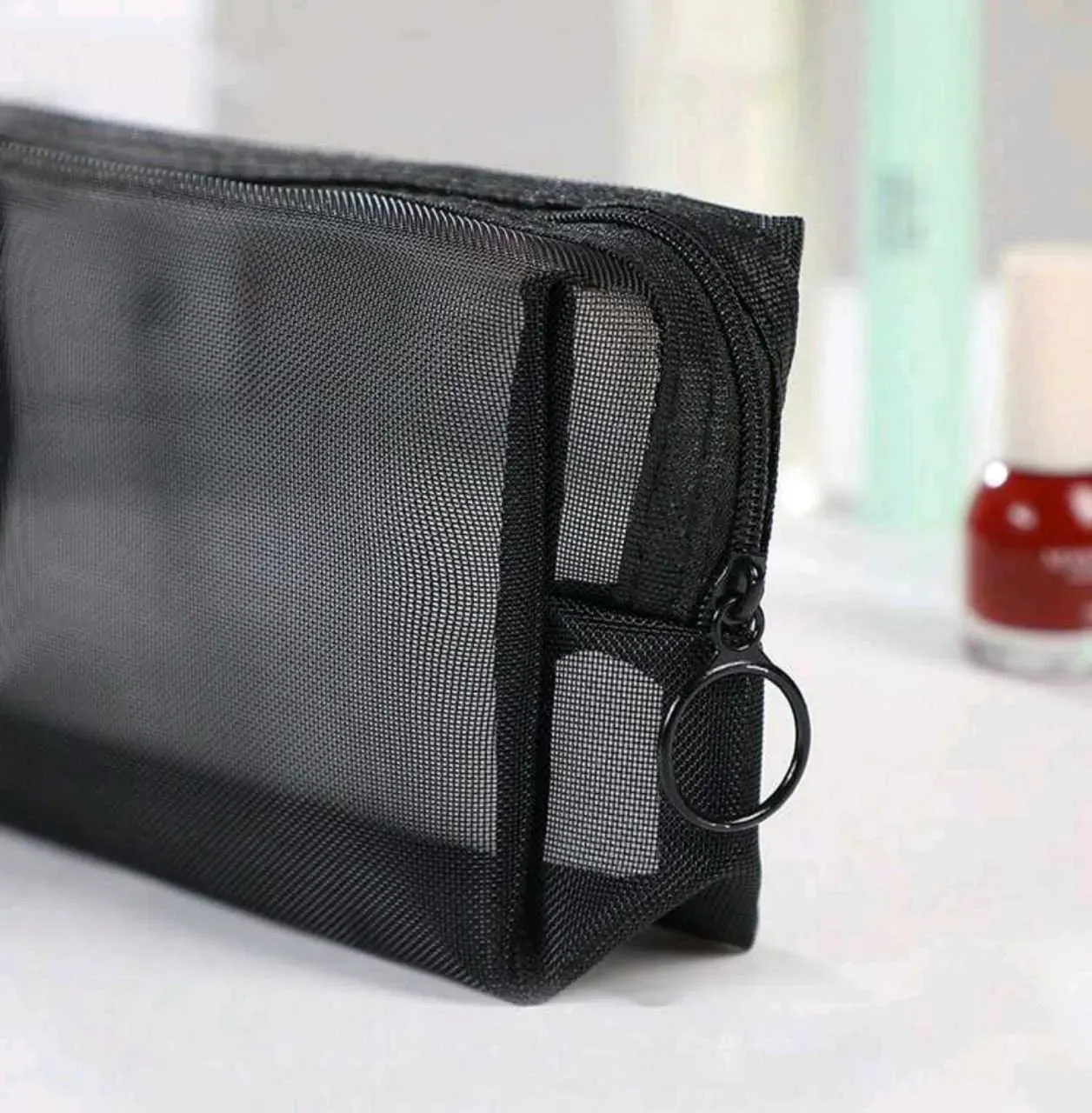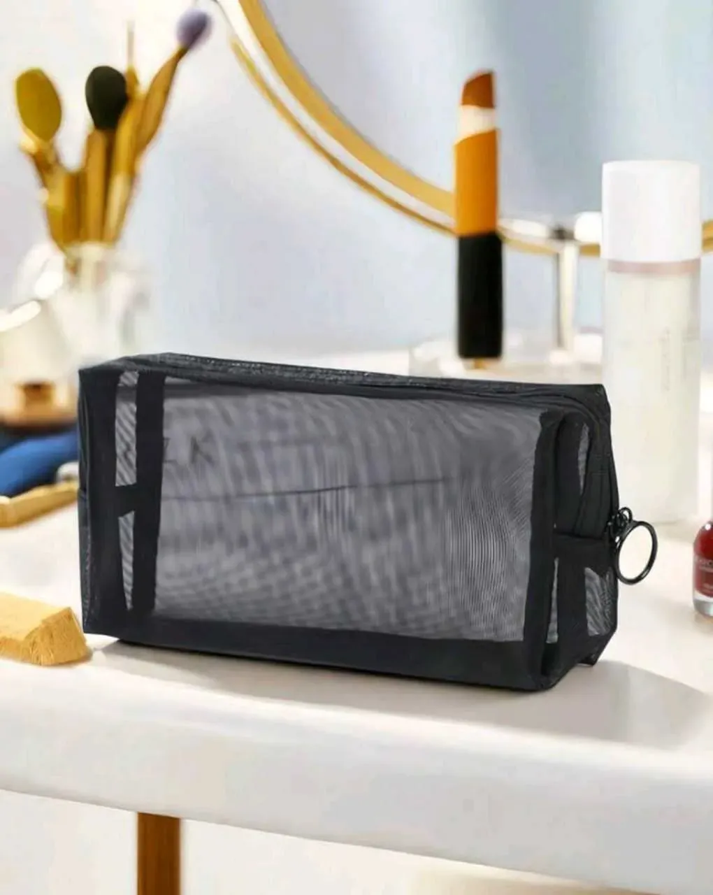 Bolsa portátil de almacenamiento de brochas de maquillaje de viaje, bolsa de cosméticos de malla, bolsa de maquillaje de malla de nylon con gran capacidad para lápiz labial, brocha para cojín y otros cosméticos, negro y transparente, regalo perfecto para amigos en viajes de negocios